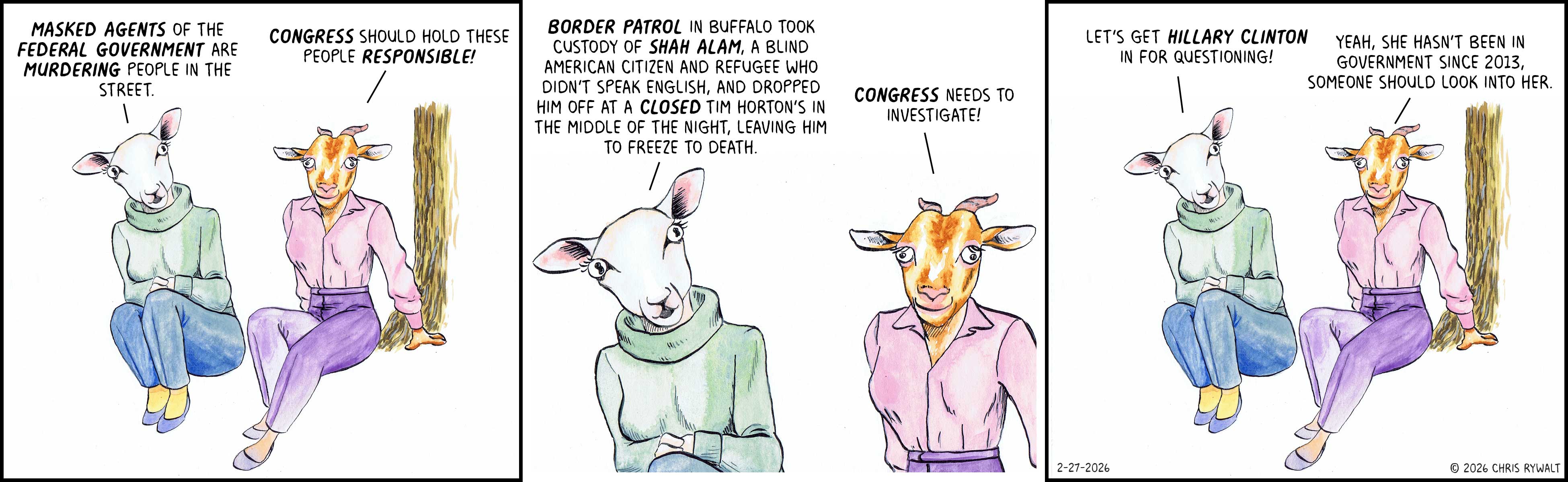 In a world where ICE and CBP and other agencies under the Department of Homeland Security have been credibly accused of killing any number of people -- Renee Good, Alex Pretti, Keith Porter Jr., eight-year-old Anadith Danay Reyes Alvarez, and many more -- it's clearly of vital importance that we bring in someone to answer questions from the House Committee on Oversight and Government Reform, and it's clear that someone needs to be...Hillary Clinton, a private citizen who isn't even mentioned in passing in the Epstein Files. Doesn't anyone have Al Gore's phone number? I'm sure he's involved somehow. Dan Quayle maybe? Richard Nixon's grandkids?